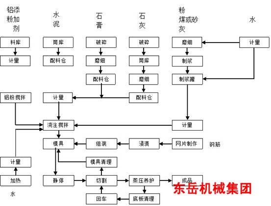 所需原材料均由汽車(chē)運入廠(chǎng)內,粉煤灰或石英砂、石粉在原材料場(chǎng)集中,使用時(shí)用裝運設備運入料斗。袋裝水泥或散裝水泥在水泥庫內儲存。使用時(shí)用裝運入料斗?;瘜W(xué)品、鋁粉等分別放在化學(xué)品庫、鋁粉庫,使用時(shí)分別裝運至生產(chǎn)車(chē)間。